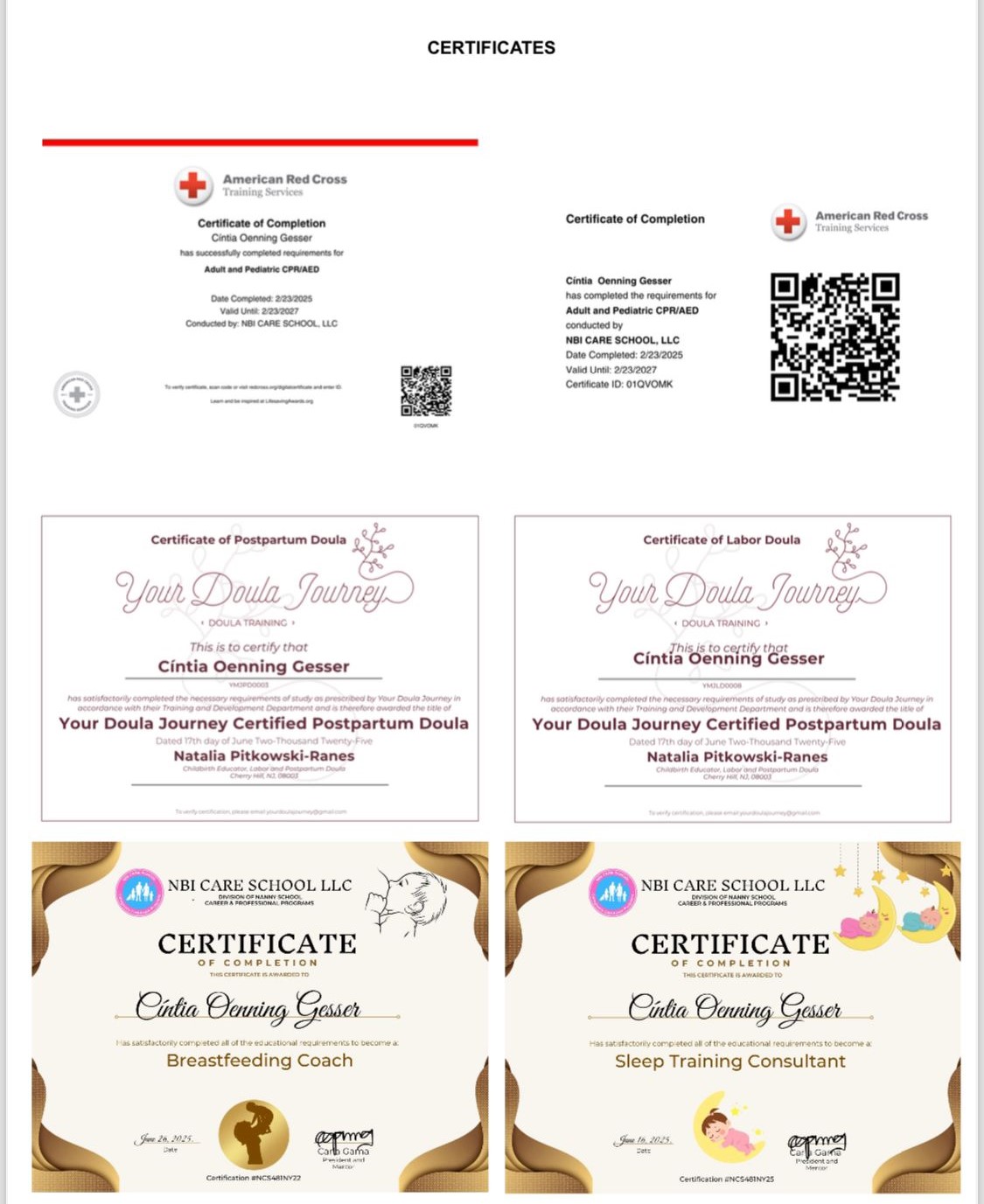 We are fully vaccinated and hold Certification in infant CPR, Breastfeeding Coach, Newborn Care Specialist and Sleep Training ensuring the utmost safety and well-being of the children under our care.